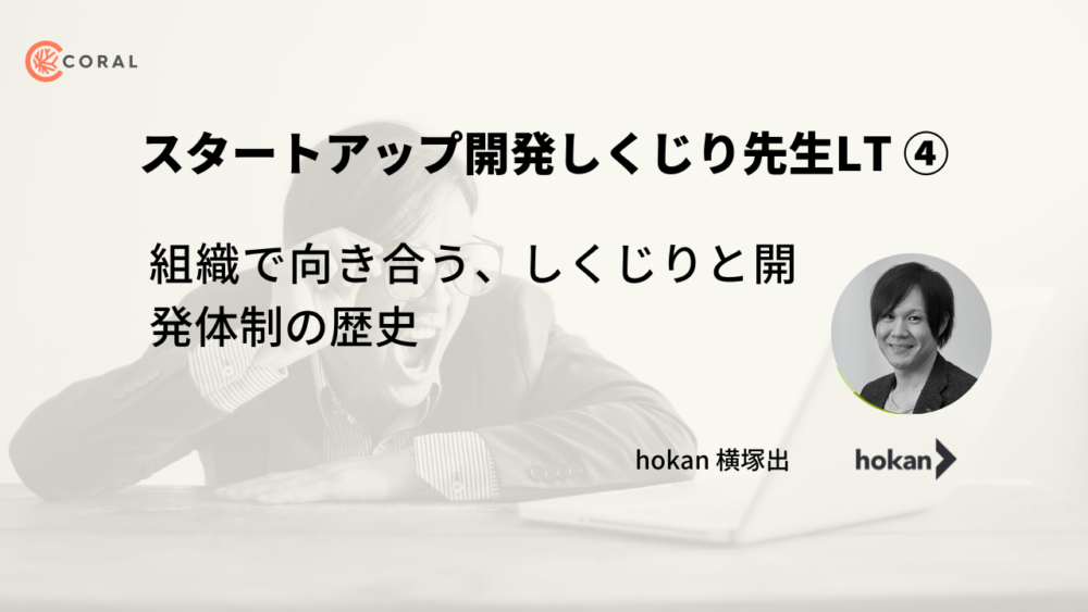 スタートアップの開発の失敗を赤裸々に語るライトニングトークには8社のCTOやエンジニア、プロダクトマネージャーが登壇。本記事では、株式会社hokanでCTOを務める横塚出氏による「組織で向き合う、しくじりと開発体制の歴史」と題したトークの内容をお伝えします。