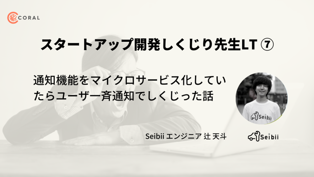 スタートアップの開発の失敗を赤裸々に語るライトニングトークに8社のCTOやエンジニア、プロダクトマネージャーが登壇。本記事では、株式会社Seibii エンジニアの辻天斗氏による「通知機能をマイクロサービス化していたらユーザ一斉通知でしくじった話」と題したトークの内容をお伝えします。