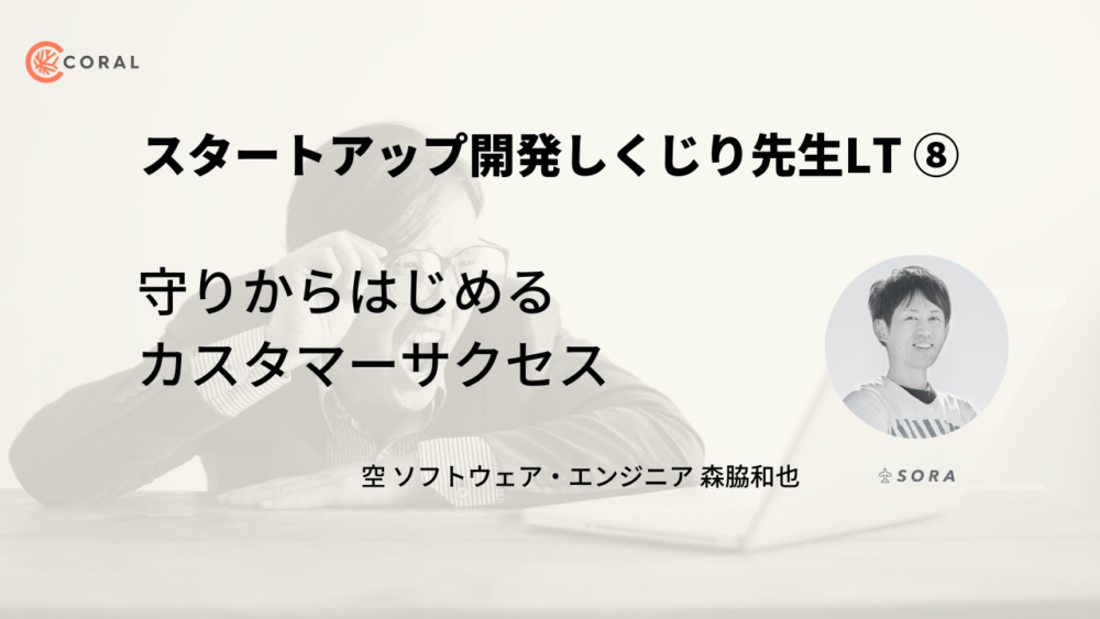 スタートアップの開発の失敗を赤裸々に語るライトニングトークに8社のCTOやエンジニア、プロダクトマネージャーが登壇。本記事では、株式会社空でソフトウェア・エンジニアを務める森脇和也氏による「守りからはじめるカスタマーサクセス」と題したトークの内容をお伝えします。