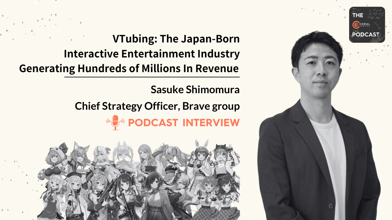 In this episode, we are joined by Sasuke Shimomura, Chief Strategy Officer of Brave group, one of Japan’s leading VTuber production companies. Brave group is a global digital IP company which mainly consists of 3 business segments: IP Production which mainly focuses on VTuber production, IP Platform and IP Solution which focus on distribution and enhancing the monetization of digital IP.