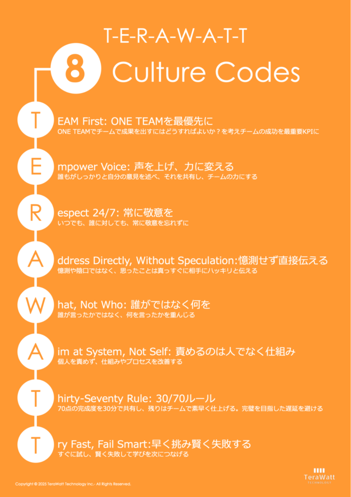 「人事制度も給与体系も、使う言葉も、バックグラウンドも違う、他部署の人間を引っ付けて、電池とロボット製造とAIを融合させるのは技術的な難しさもさることながら、エンジニアのマインドセットの変革を中心としたチームや組織づくりが大きなチャレンジとなります。TeraWattでは分野横断的チームを構築する中で現場レベルで見えてきた様々な課題をベースに8つのカルチャー原則を作っています。これはトップダウンで降ろされてきた形骸化したスローガンではなく、現場エンジニアの衝突と血肉から作られたボトムアップのカルチャー原則なのです」