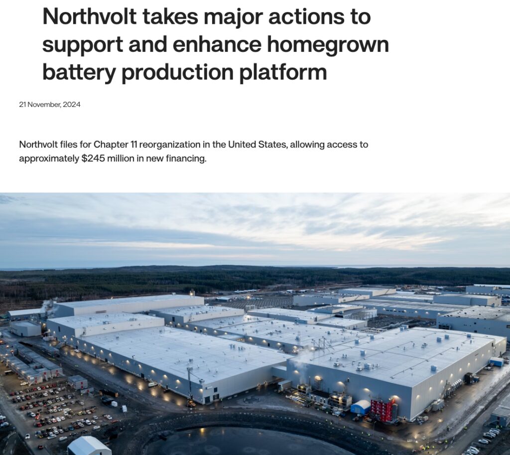 リチウムイオン電池生産は、特に東アジア(中国・韓国・日本)のメーカーが技術も市場も圧倒的な優位を持っています。そのことからNorthvoltは「ヨーロッパの電池自立を目指す」という期待を一身に集めて、北欧をはじめヨーロッパ各地や北米にも複数のギガファクトリーの建設を打ち出し、計画・建設を進めていました。しかし、生産能力は当初目標だった16GWh(ギガワット時)に対して、実際の生産は 1 GWh に満たない水準にとどまり、、品質と納期の問題で世界的大手自動車メーカーとの契約も打ち切りとなる厳しい状況に陥ったのでした。