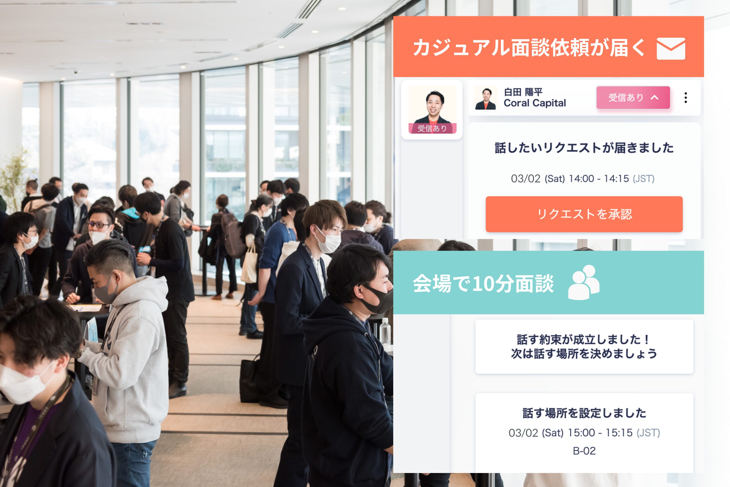 イベント参加者とスタートアップは、オンライン上で互いのプロフィールを閲覧できます。気になる相手がいれば、メッセージを送ってイベント当日のカジュアル1on1面談(約10分)を予約できます。