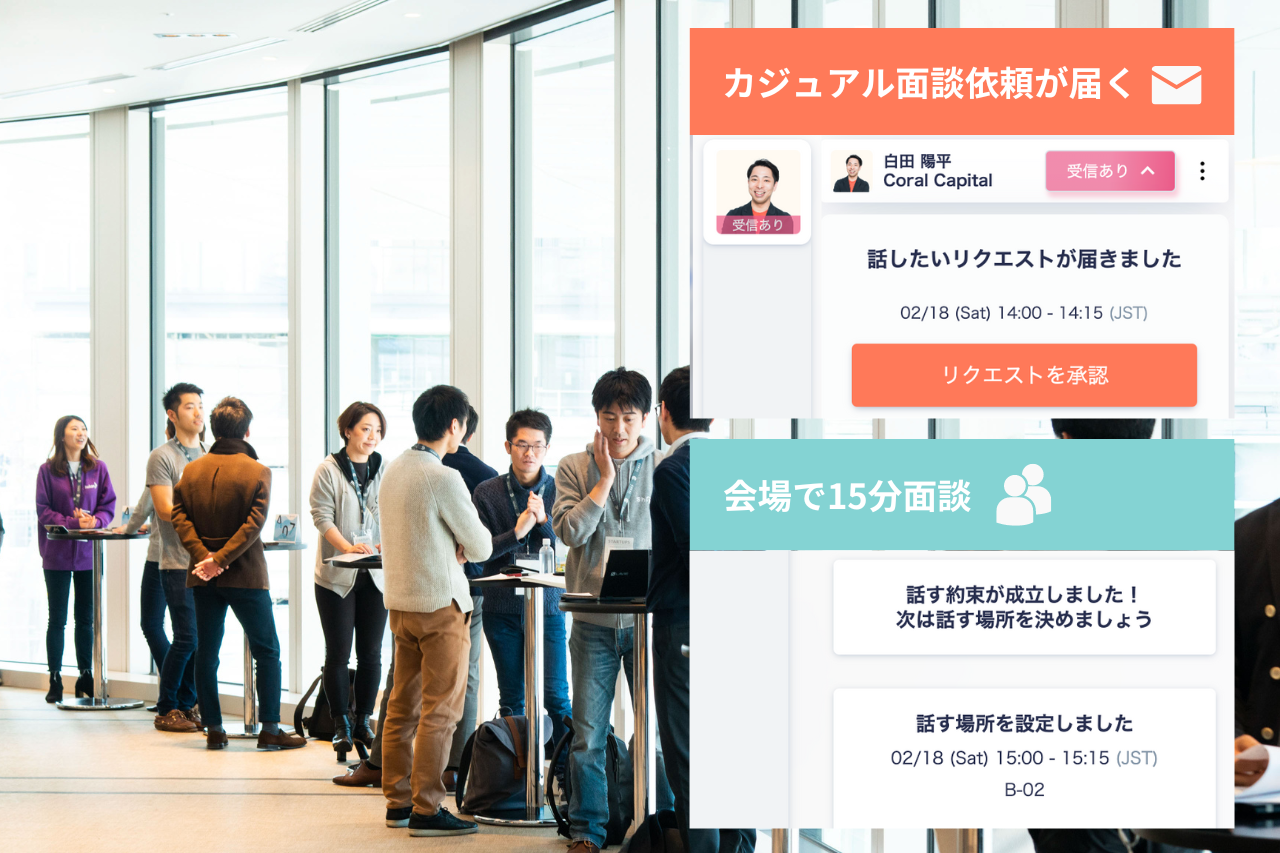 参加チケットご購入後は、気になるスタートアップと事前にカジュアル面談を設定することが可能です。Eventhubで登録された職歴等のプロフィールをもとに参加スタートアップから当日のカジュアル面談リクエストが届くことがあります。Eventhub上でイベント当日のいつどこで会うかを決めます。